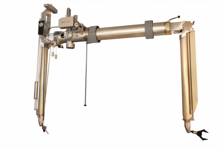 Arbeitsarm, Bedienarm und Wanddurchführung können schnell und einfach voneinander getrennt werden. Dadurch kann die Wanddurchführung für Wartungsarbeiten in der Abschirmwand bleiben und behält somit ihre Strahlenschutzeigenschaft und den gasdichten Verschluss.
