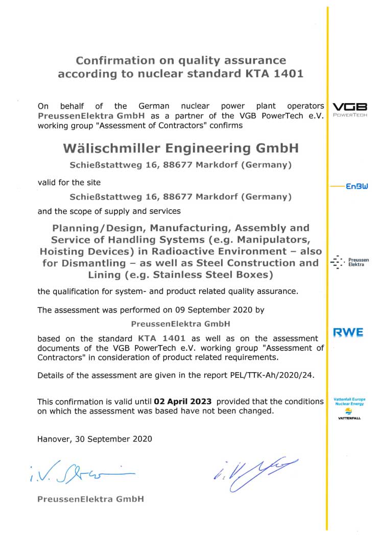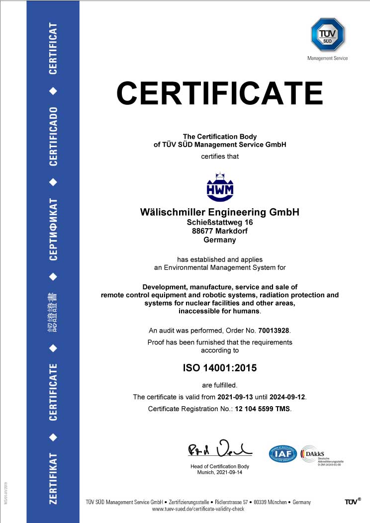 Wälischmiller Engineering GmbH quality management system has for many years been certified pursuant to the DIN EN ISO 9001:2015 Standards and Regulation KTA 1401 of the Nuclear Safety Standards Commission (KTA). The environmental resource management system is certified according DIN EN ISO 14001:2015.