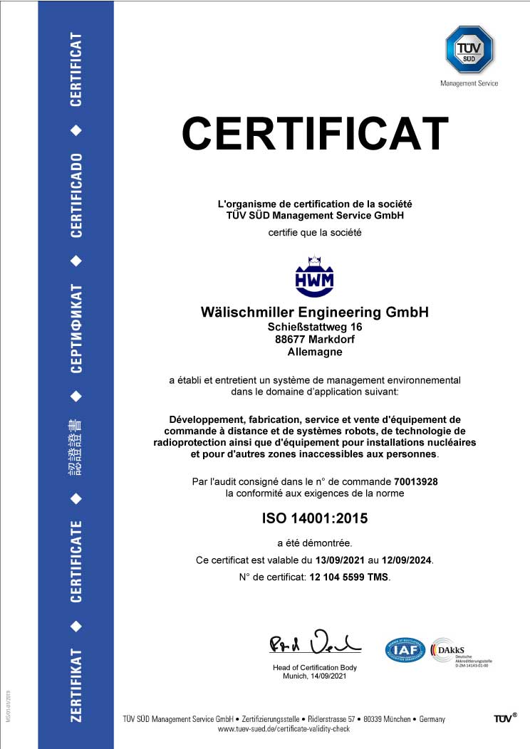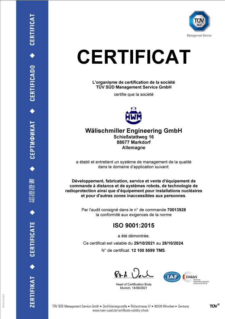 Le système de gestion de la qualité de la société Wälischmiller Engineering GmbH est certifié depuis plusieurs années selon la norme DIN EN ISO 9001:2008 et conformément à la règle KTA 1401 de la commission de sûreté nucléaire allemande. Le system de management environnemental est quant à lui certifié selon la norme DIN EN ISO 14001:2015.